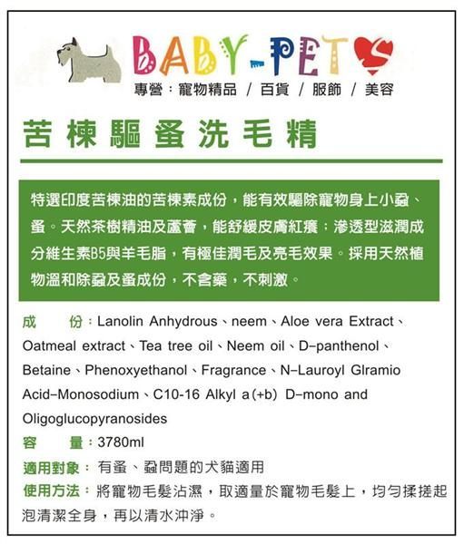 特選印度苦楝油的苦楝素成份,能有效驅除寵物身上小蝨、蚤。天然茶樹精油及蘆薈,能舒緩皮膚紅癢;滲透型滋潤成分維生素B5與羊毛脂,有極佳潤毛及亮毛效果。採用天然植物溫和除蝨成份,不含藥,不刺激。