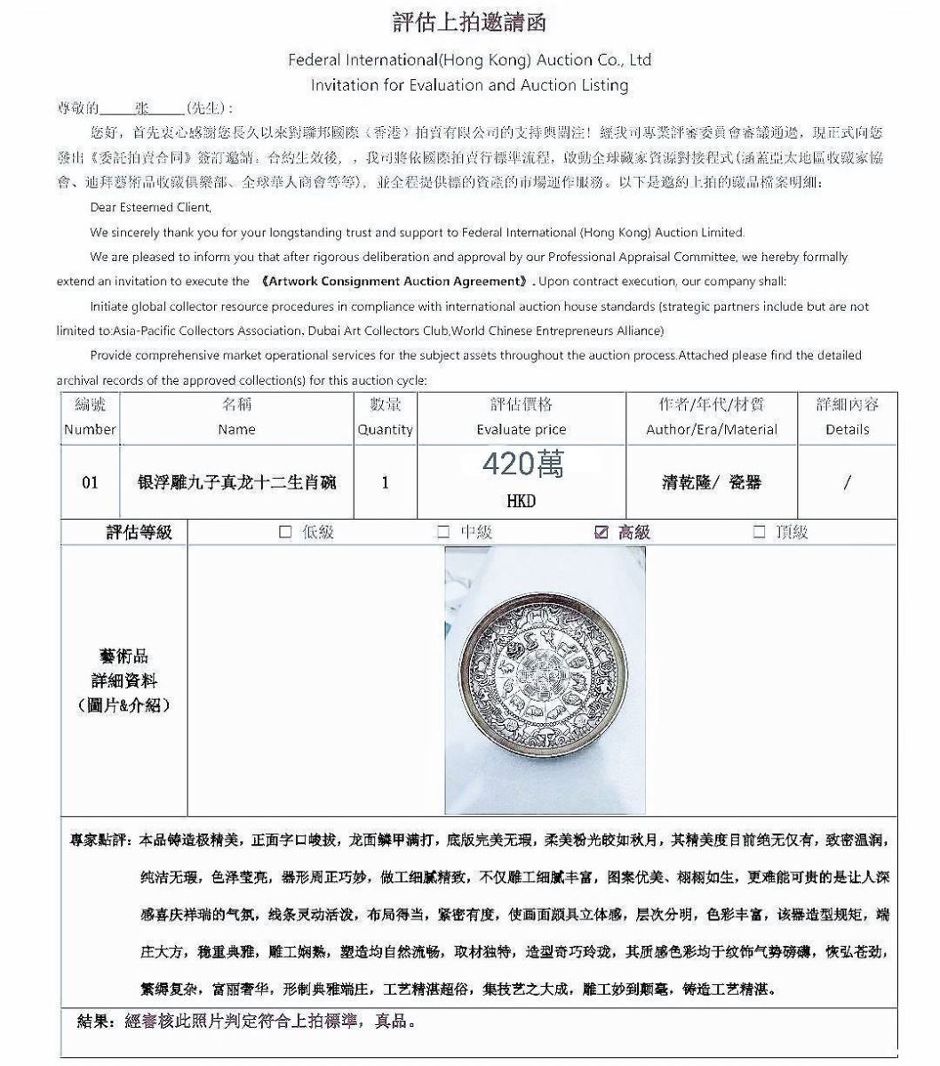 銀浮雕九子真龍十二生肖碗